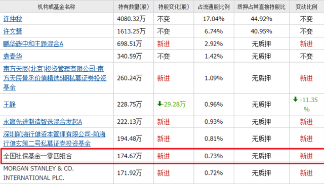 社保基金一零四组合新进174万股,位列第九大流通股东。