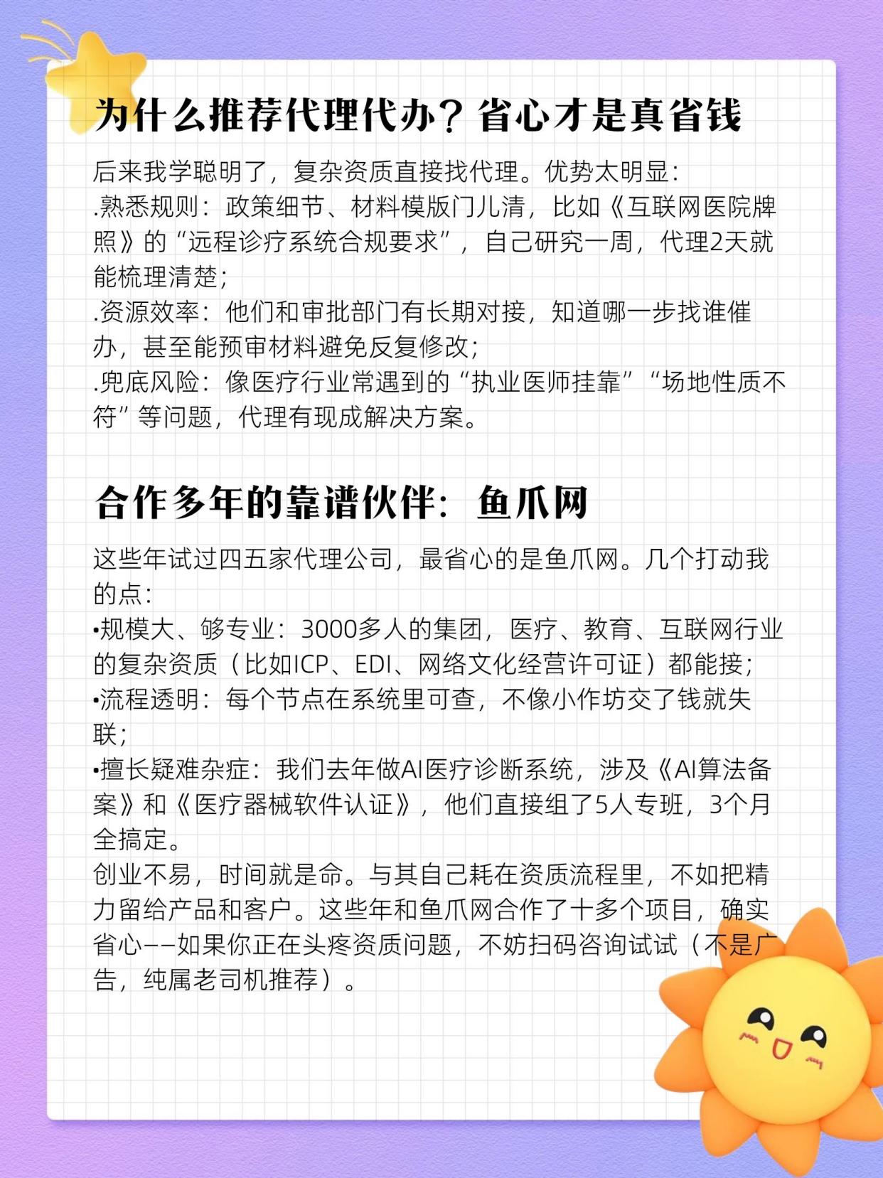 .兜底风险:像医疗行业常遇到的“执业医师挂靠”“场地性质不符”等问题,代理有现成解决方案。