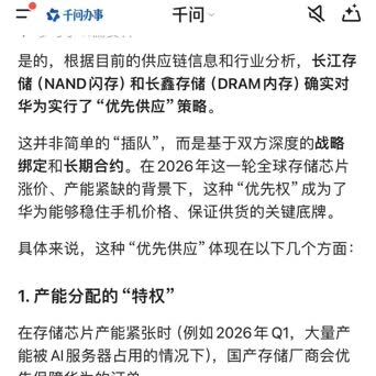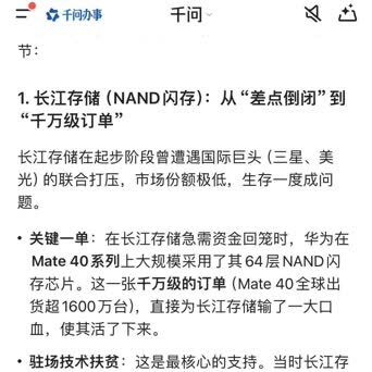千问说长江存储最需要资金回笼的时候,华为把Mate 40系列千万级订单交给长江做让厂家存储活了下来,而且还提供驻场技术扶贫,手把手帮助他们改进工艺提高良率。